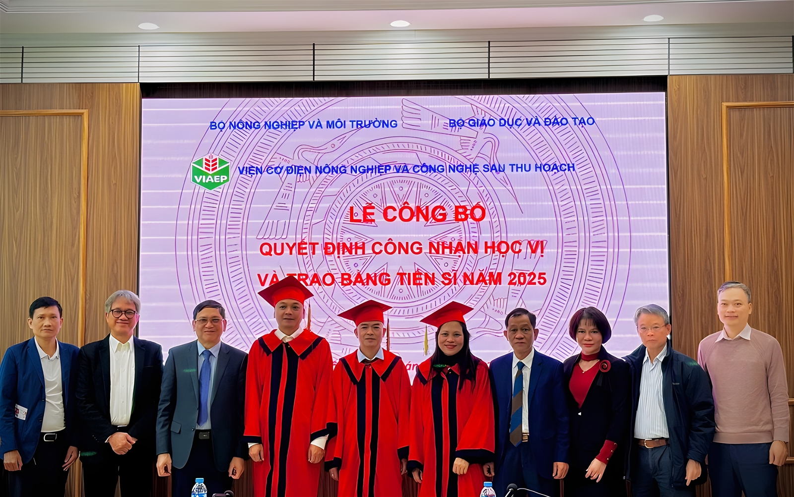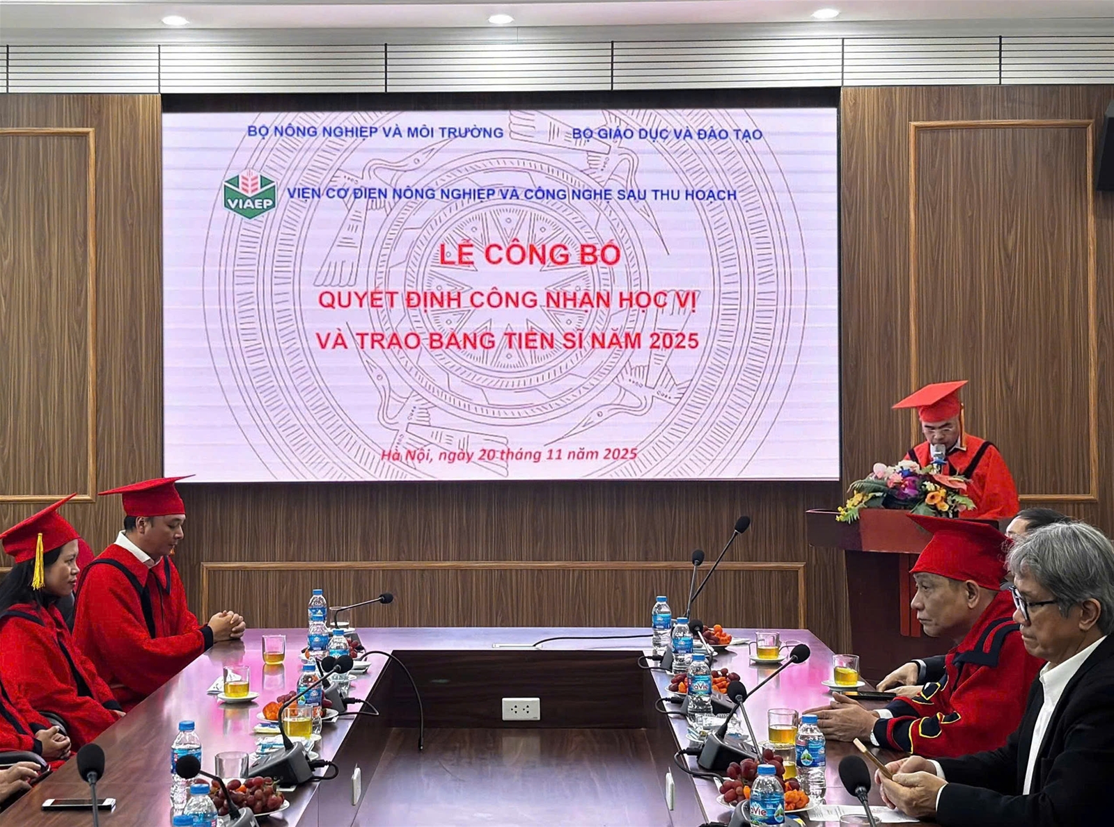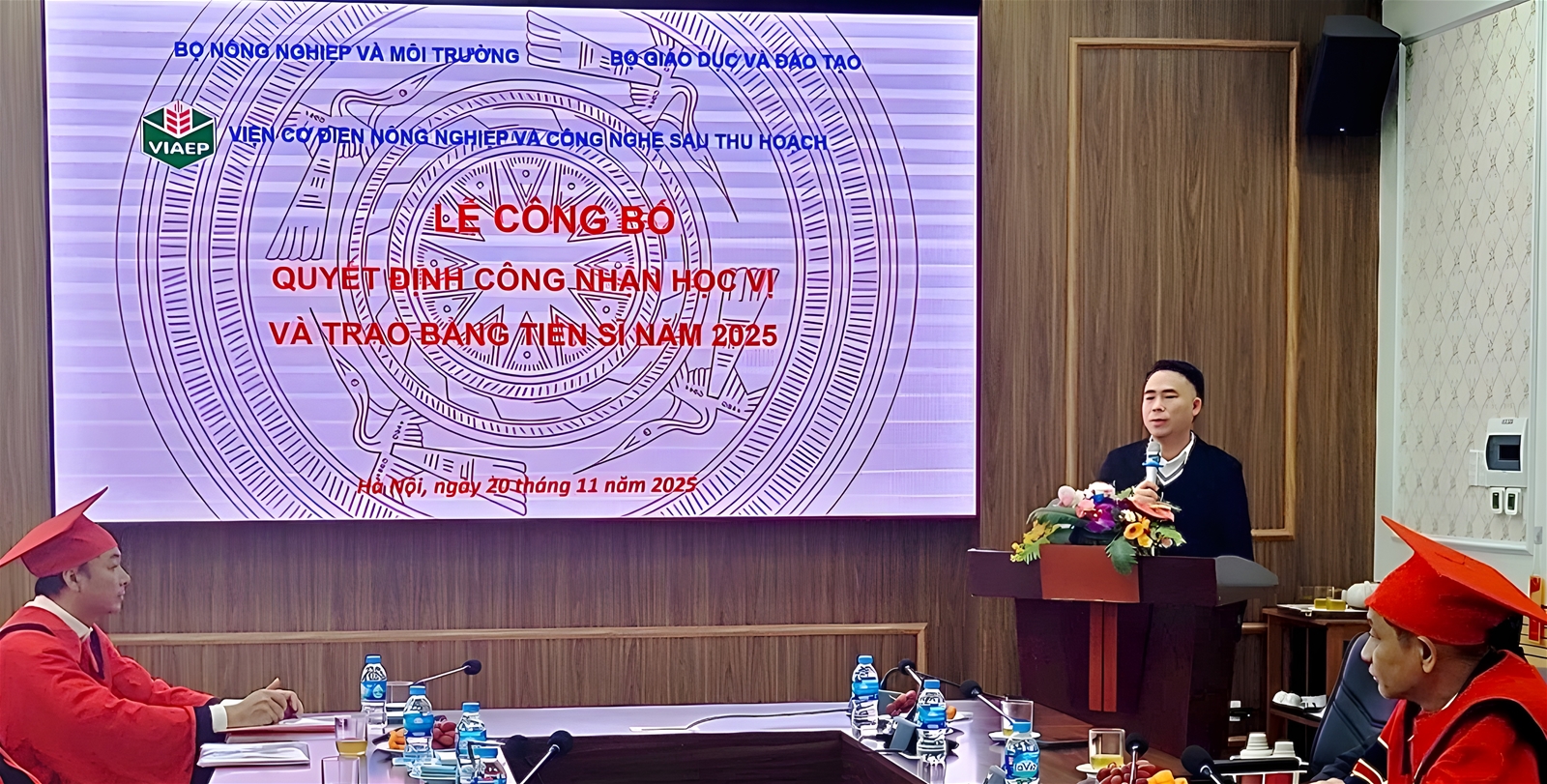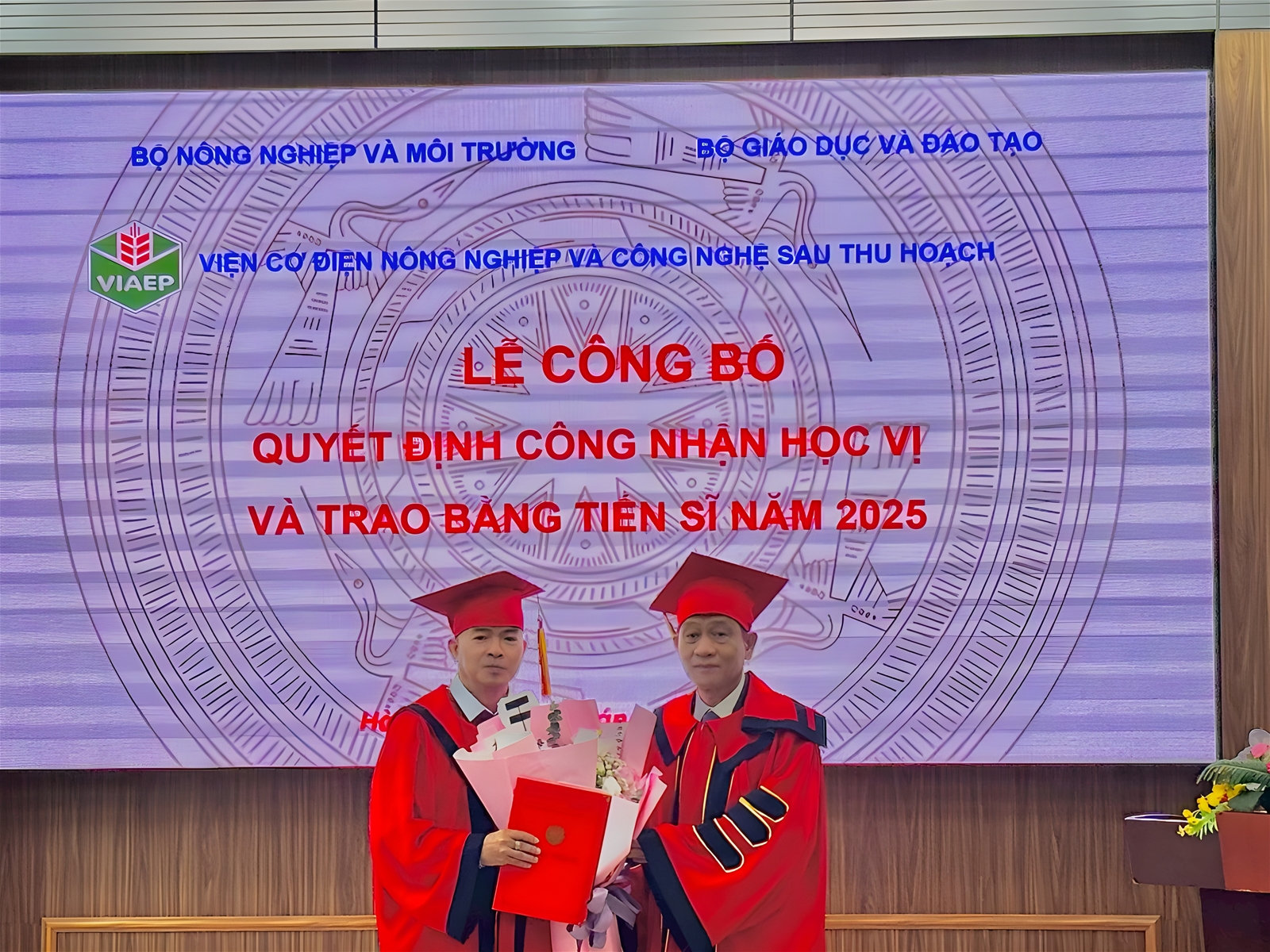 Sáng ngày 20/11/2025, Viện Cơ điện nông nghiệp và Công nghệ sau thu hoạch (VIAEP) long trọng tổ chức buổi gặp mặt kỷ niệm ngày Nhà giáo Việt Nam và Lễ trao bằng tiến sĩ cho 3 Nghiên cứu sinh tốt nghiệp năm 2024 và 2025.